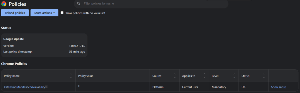 This Chrome policy controls whether extensions using the older Manifest V2 format are allowed to run. Google is gradually phasing out Manifest V2 in favor of Manifest V3, which is more secure and privacy-focused but limits what some extensions can do.