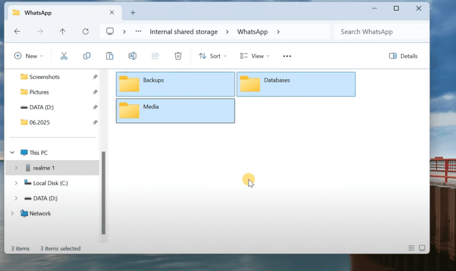- Copy the previously saved folders (Backups, Databases, Media) from your PC back into your phone’s WhatsApp directory.