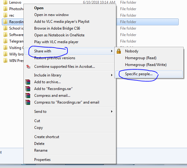 अब आप जिस भी फोल्डर को नेटवर्क पर शेयर करना चाहते हैं उस पर राइट क्लिक करें और उसके बाद जो मीनू आपको दिखाई देता है उसके अंदर Share With पर जाकर के Specific People पर क्लिक कर दें, जैसा की नीचे दी गई स्क्रीन में दिखाया गया है|