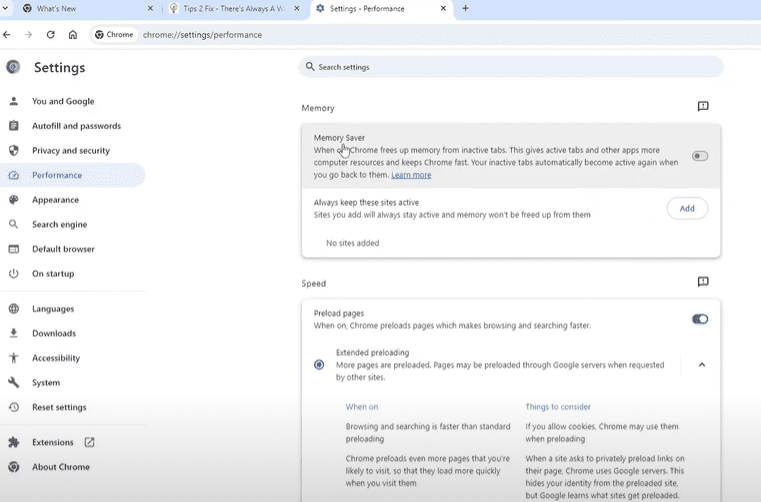 In addition to Memory Saver, Chrome has introduced preload settings to improve how fast pages load: