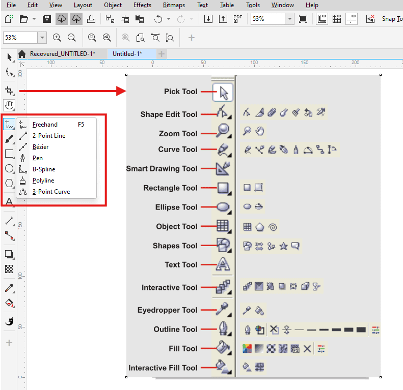 To begin, locate the drawing tools on CorelDRAW’s toolbar. These include: